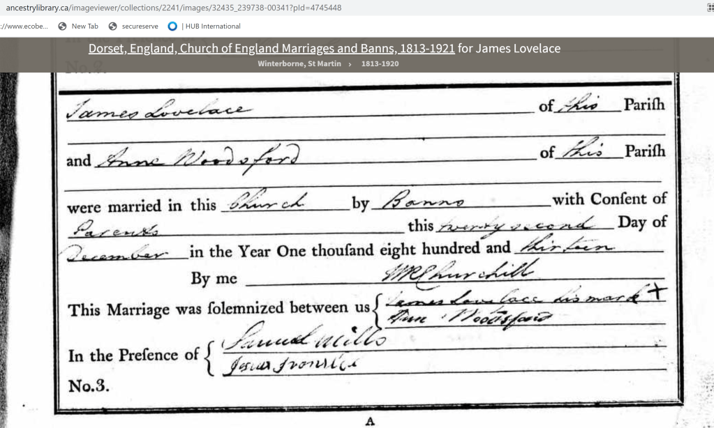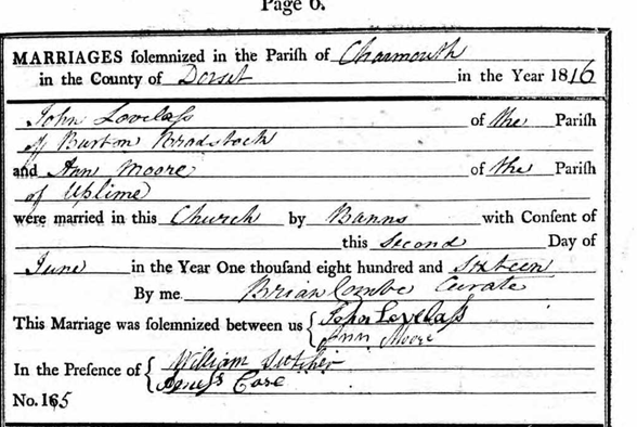 2. John Loveless marriage to Ann Mary Way in Tolpuddle, 23 April 1812. Witness, his sister, Dinniah Loveless.