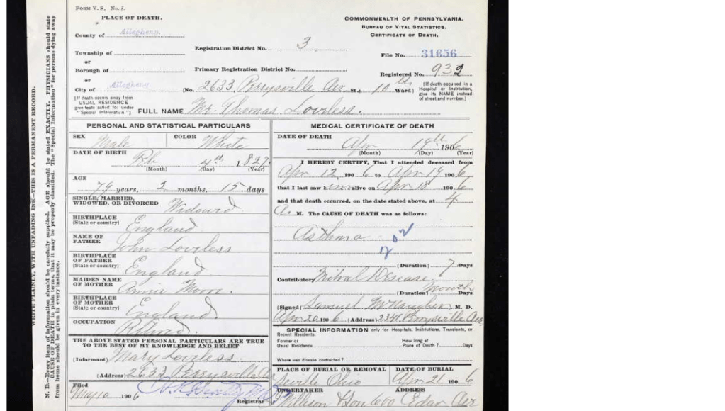 Thomas is significant because his death certificate identifies his mother as Annie Moore. The informant is likely his daughter Mary A. Loveless (1866-1926). (She married John Fraser in 1909, after her father’s death)