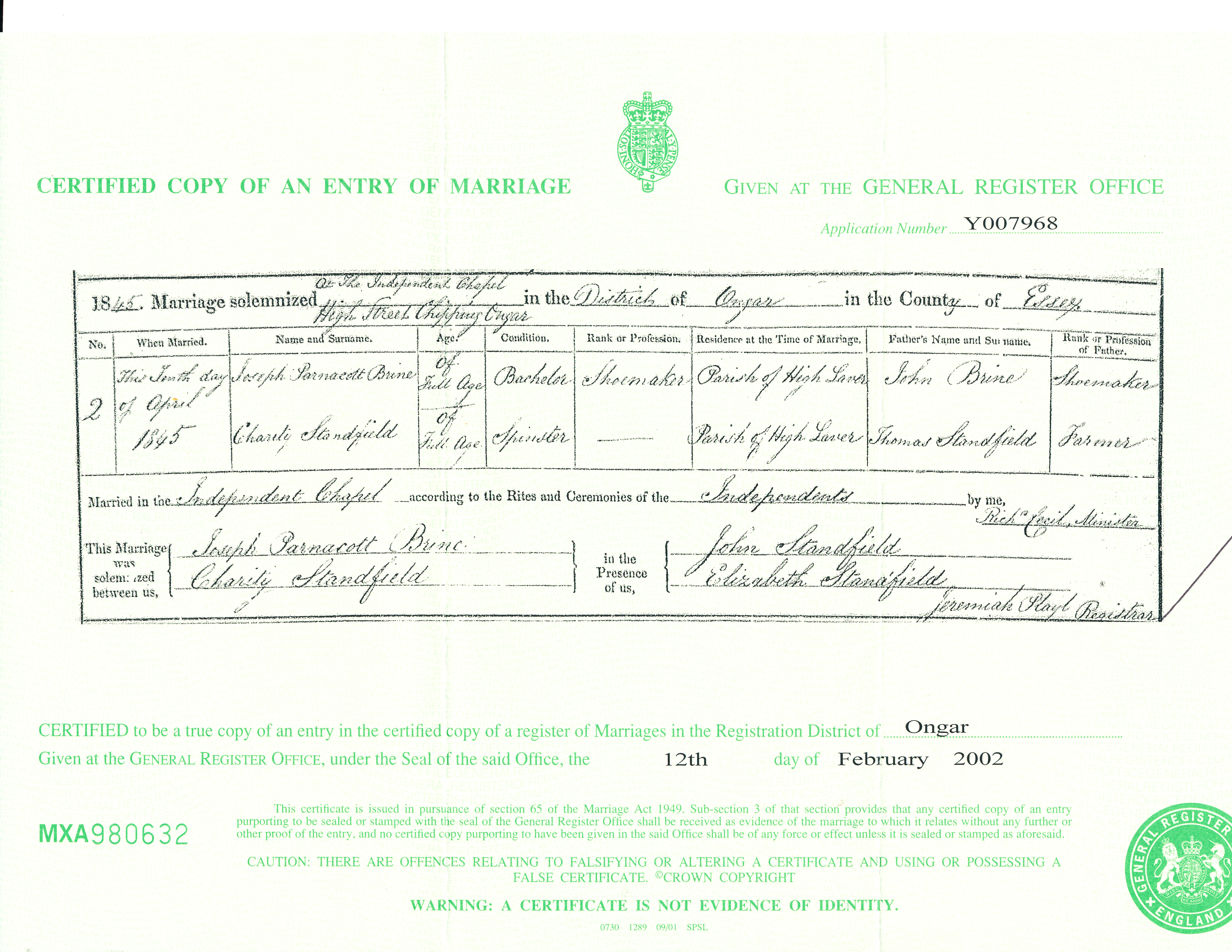iii) Joseph Parnacott Brine and Charity Standfield Marriage Certificate